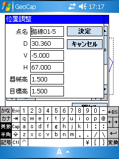 位置調整を選択した場合には、左画面のように野帳データの修正ができます。修正後は計算を行い、精度点検を行ってください。 |