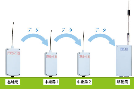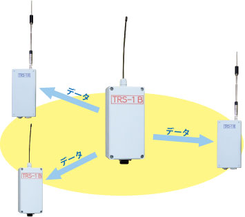 基地局用「TRS-1B」は中継通信が可能です。あらかじめ中継ルートを決めておけば、最大10台まで中継してデータを搬送できます。この機能によりより遠くまでデータを配信できます。