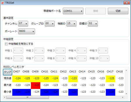 簡単にお使いいただける設定ソフトウェア「TRSset」付属で、無線機の設定も簡単かつ短時間で設定できます。またTRSsetには周辺電波強度をリアルタイムにモニタする「RSSIレベルモニタ」機能により他電波との干渉などもリアルタイムで確認、込み合うチャンネルの回避が可能です。