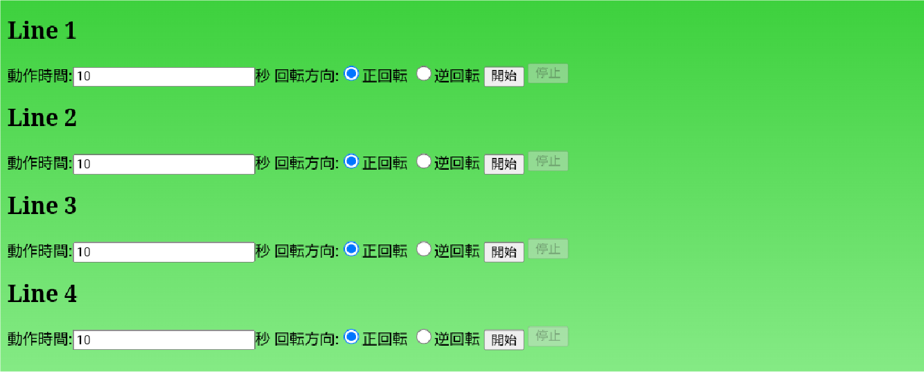 開始ボタンでモータが動作し、停止ボタンで停止します。